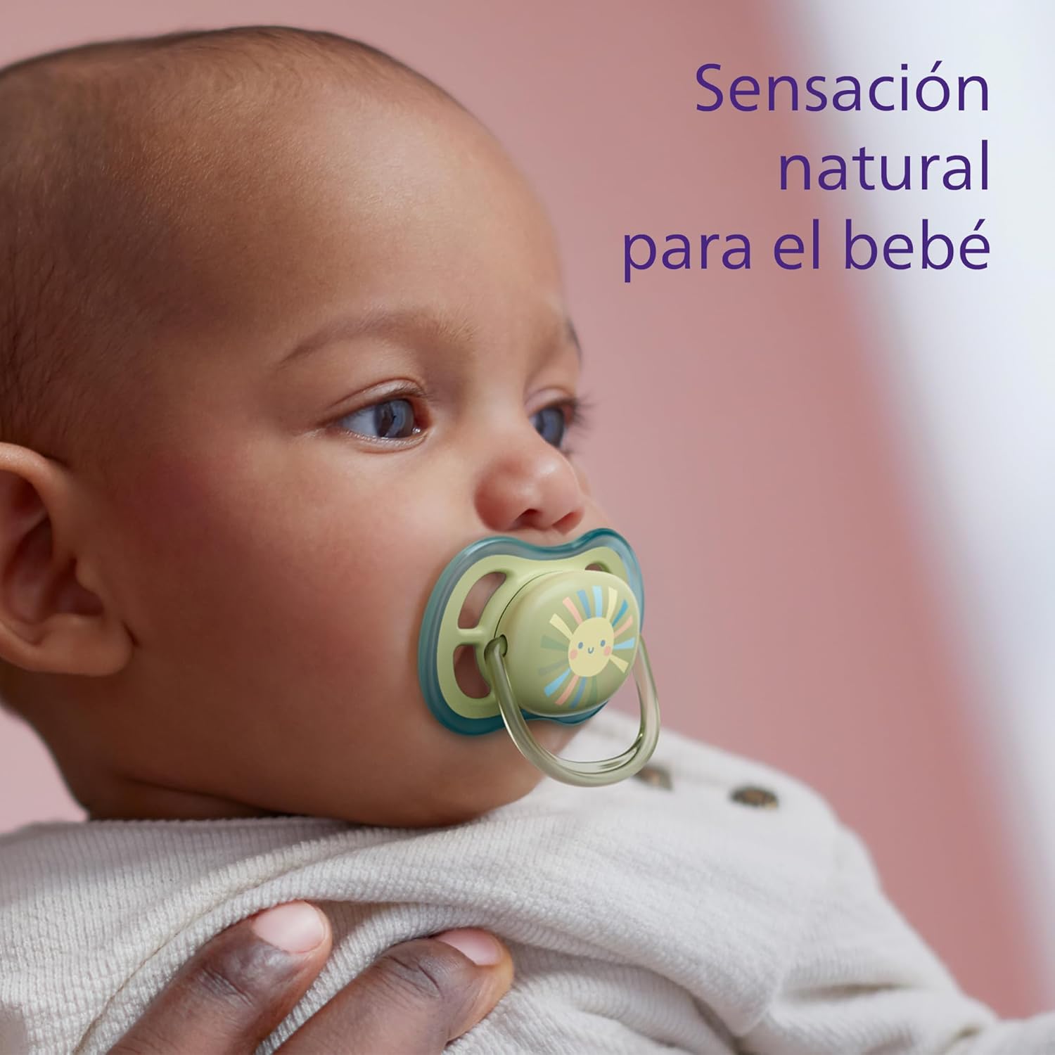 Tranquilidad con la comodidad del aire. El chupete ultra air de Philips Avent tiene orificios de aire extragrandes para mantener seca la piel de su bebé. Disponible en varios colores y diseños.